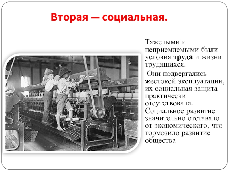 Они подвергались жестокой эксплуатации, их социальная защита практически отсутствовала. Социальное развитие значительно отставало от экономического, что тормозило развитие общества