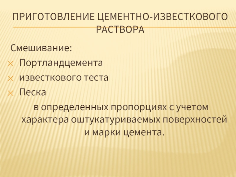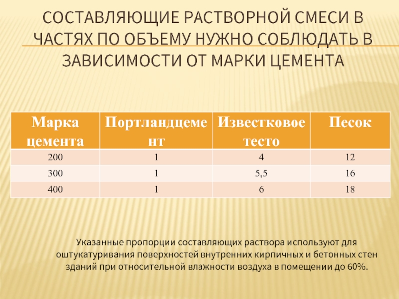 Указанные пропорции составляющих раствора используют для оштукатуривания поверхностей внутренних кирпичных и бетонных стен зданий при относительной влажности воздуха в помещении до 60%.