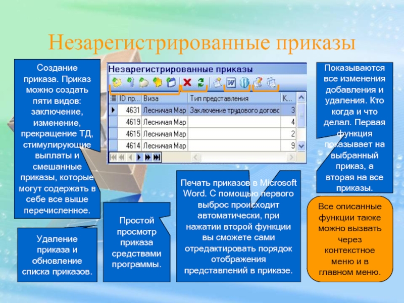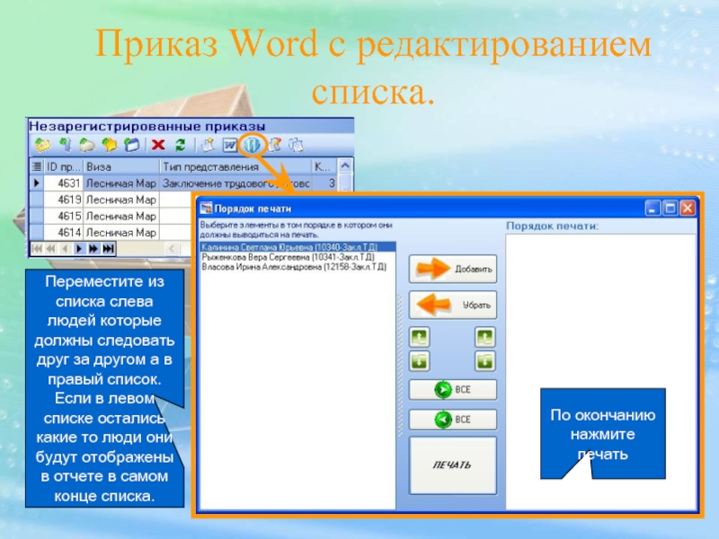 Печать приказов в Microsoft Word. С помощью первого выброс происходит автоматически, при нажатии второй функции вы сможете сами отредактировать порядок отображения представлений в приказе.
