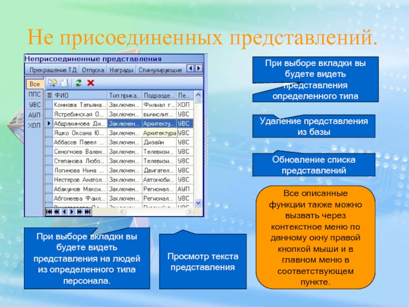 При выборе вкладки вы будете видеть представления на людей из определенного типа персонала.