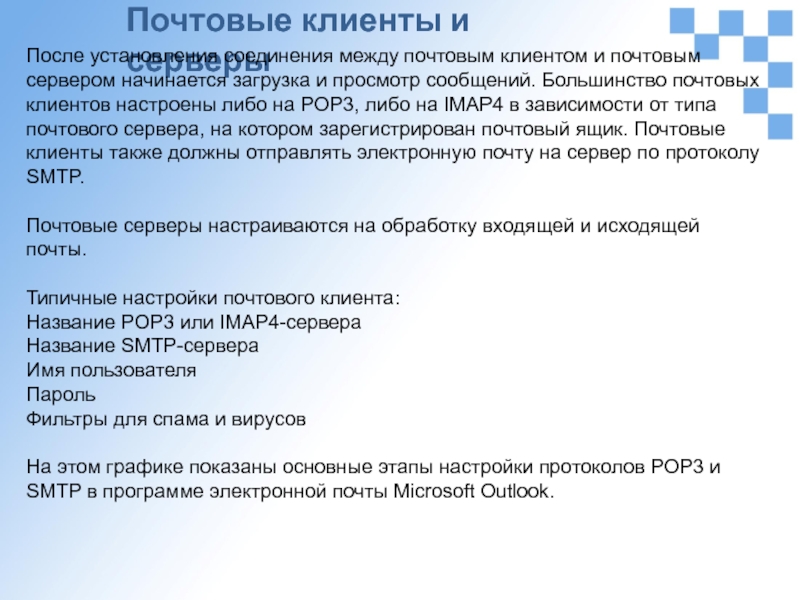 сервером начинается загрузка и просмотр сообщений. Большинство почтовых клиентов настроены либо на POP3, либо на IMAP4 в зависимости от типа почтового сервера, на котором зарегистрирован почтовый ящик. Почтовые клиенты также должны отправлять электронную почту на сервер по протоколу SMTP.