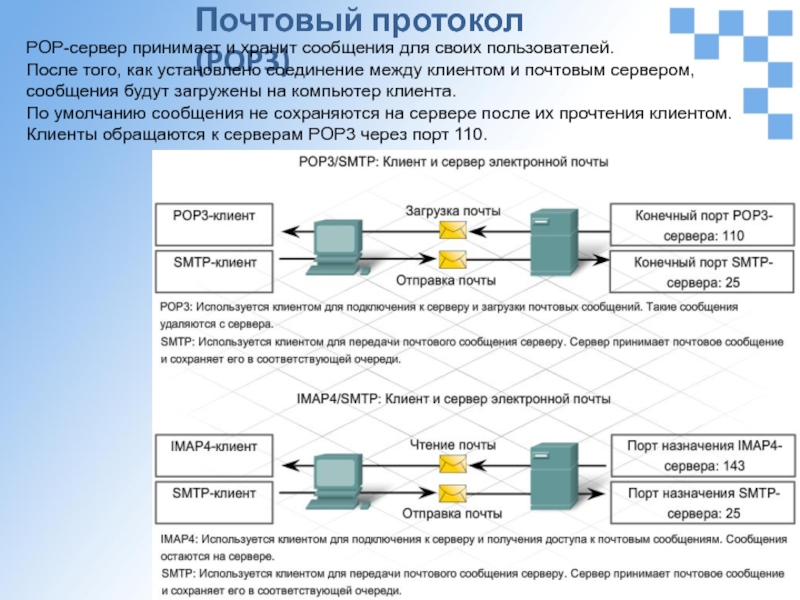 По умолчанию сообщения не сохраняются на сервере после их прочтения клиентом. Клиенты обращаются к серверам POP3 через порт 110.