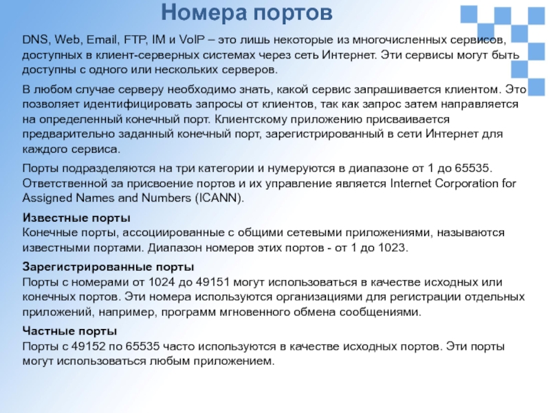 В любом случае серверу необходимо знать, какой сервис запрашивается клиентом. Это позволяет идентифицировать запросы от клиентов, так как запрос затем направляется на определенный конечный порт. Клиентскому приложению присваивается предварительно заданный конечный порт, зарегистрированный в сети Интернет для каждого сервиса.