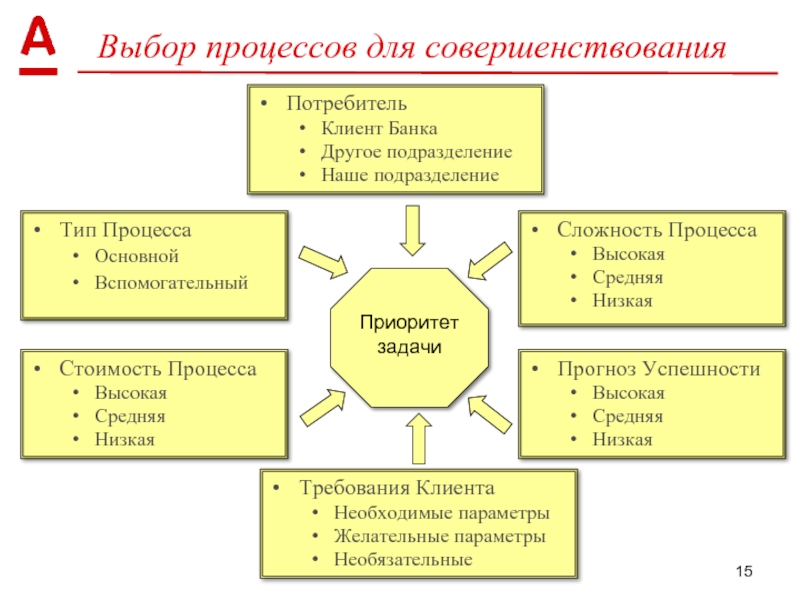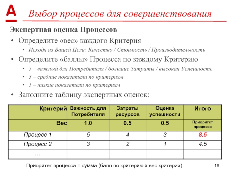 Приоритет процесса = сумма (балл по критерию х вес критерия)