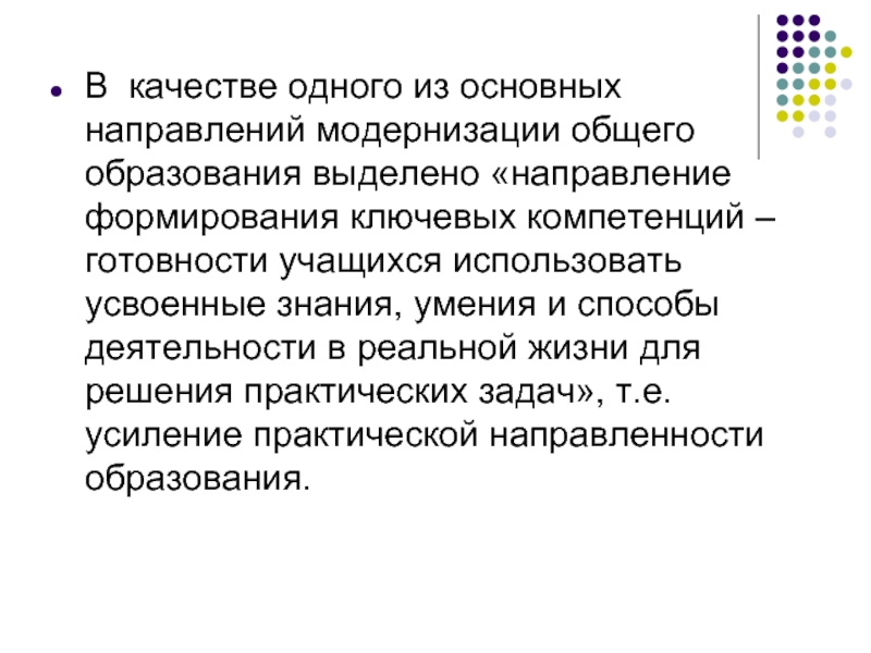 формирования ключевых компетенций – готовности учащихся использовать усвоенные знания, умения и способы деятельности в реальной жизни для решения практических задач», т.е. усиление практической направленности образования.