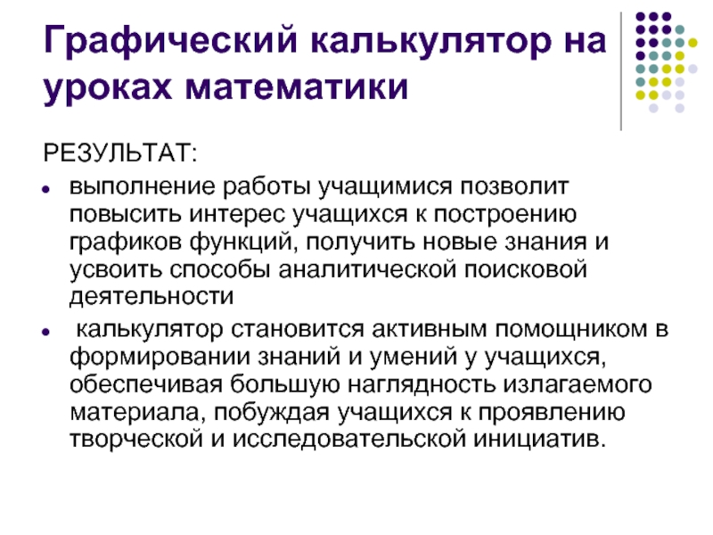 калькулятор становится активным помощником в формировании знаний и умений у учащихся, обеспечивая большую наглядность излагаемого материала, побуждая учащихся к проявлению творческой и исследовательской инициатив.