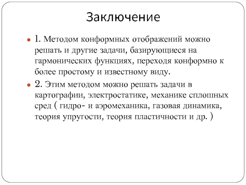 2. Этим методом можно решать задачи в картографии, электростатике, механике сплошных сред ( гидро- и аэромеханика, газовая динамика, теория упругости, теория пластичности и др. )