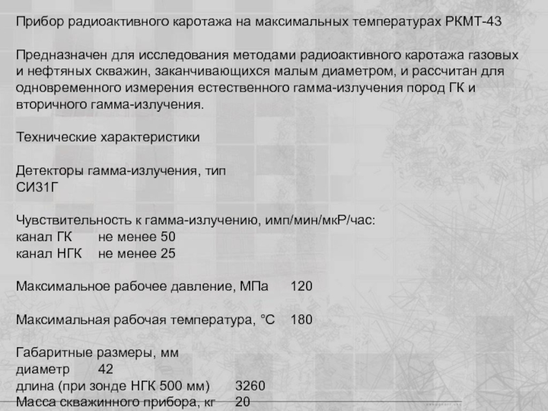 Слайд 18Прибор радиоактивного каротажа на максимальных температурах РКМТ-43
