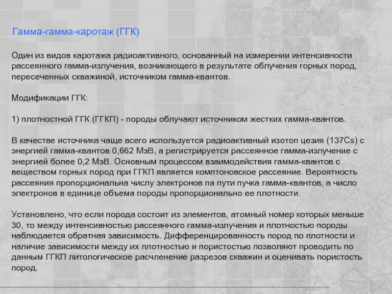 гамма-гамма каротаж (ГГК) - основан на измерении интенсивности рассеянного гамма-излучения, возникающего при облучении пород источником гамма-квантов;