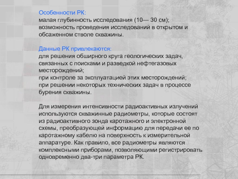 созданы современные многопараметровые рограммно-управляемые аппаратурно-методические комплексы радиоактивного каротажа для нефтегазовых скважин, позволяющие существенно повысить геологическую информативность и эффективность методов РК и решать разнообразные геологические задачи.
