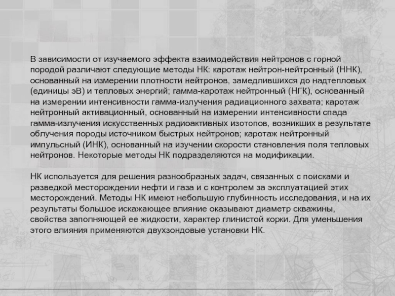 Слайд 9В зависимости от изучаемого эффекта взаимодействия нейтронов с горной породой различают