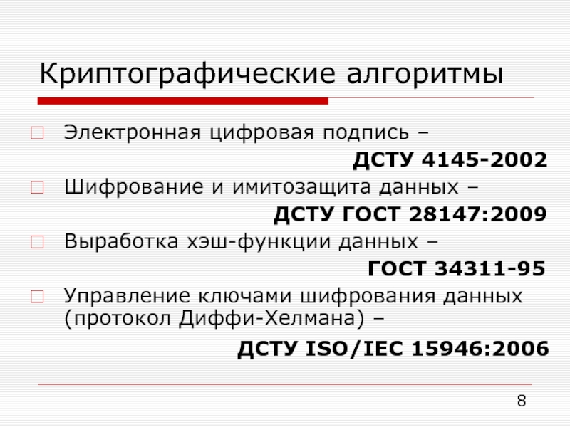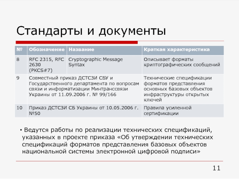 «Национальная система электронной цифровой подписи. Технические спецификации представления базовых объектов», утвержден совместным приказом ДСТСЗИ СБ Украины и Государственного департамента по вопросам связи и информатизации Министерства транспорта и связи Украины от 11.09.2006 г. № 99/166.