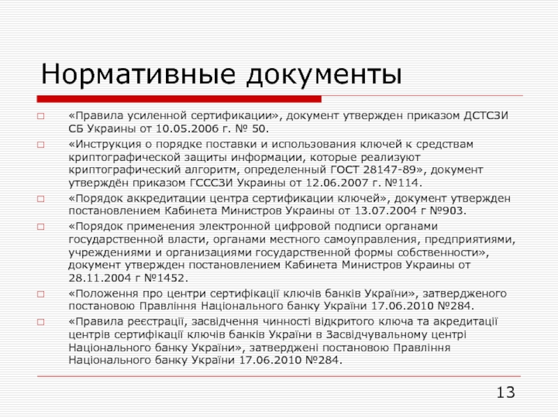 «Порядок аккредитации центра сертификации ключей», документ утвержден постановлением Кабинета Министров Украины от 13.07.2004 г №903.