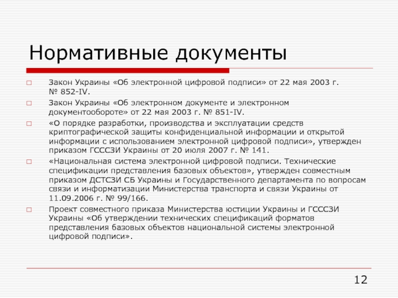 «Порядок применения электронной цифровой подписи органами государственной власти, органами местного самоуправления, предприятиями, учреждениями и организациями государственной формы собственности», документ утвержден постановлением Кабинета Министров Украины от 28.11.2004 г №1452.