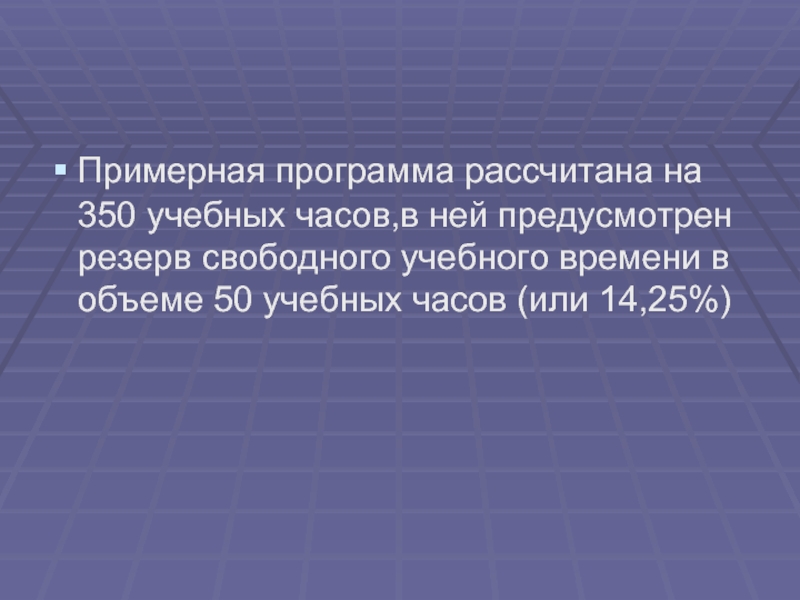 Слайд 12Примерная программа рассчитана на 350 учебных часов,в ней предусмотрен резерв свободного