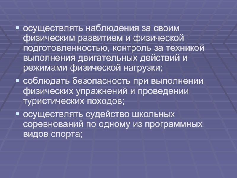 Слайд 31осуществлять наблюдения за своим физическим развитием и физической подготовленностью, контроль за