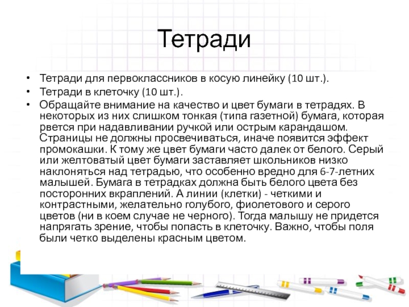 Обращайте внимание на качество и цвет бумаги в тетрадях. В некоторых из них слишком тонкая (типа газетной) бумага, которая рвется при надавливании ручкой или острым карандашом. Страницы не должны просвечиваться, иначе появится эффект промокашки. К тому же цвет бумаги часто далек от белого. Серый или желтоватый цвет бумаги заставляет школьников низко наклоняться над тетрадью, что особенно вредно для 6-7-летних малышей. Бумага в тетрадках должна быть белого цвета без посторонних вкраплений. А линии (клетки) - четкими и контрастными, желательно голубого, фиолетового и серого цветов (ни в коем случае не черного). Тогда малышу не придется напрягать зрение, чтобы попасть в клеточку. Важно, чтобы поля были четко выделены красным цветом.