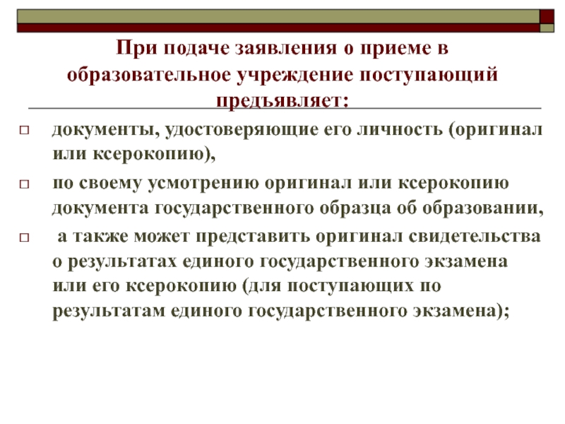 Слайд 22При подаче заявления о приеме в образовательное учреждение поступающий предъявляет: