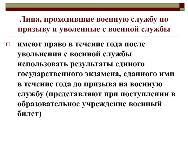 право в течение года после увольнения с военной службы использовать результаты единого государственного экзамена, сданного ими в течение года до призыва на военную службу (представляют при поступлении в образовательное учреждение военный билет)