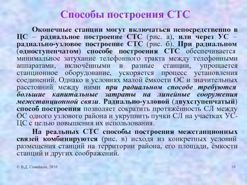 АМТС, расположенные на зоновых сетях, являются оконечными станциями междугородной сети, а УАК – транзитными. Наиболее распространенным вариантом построения внутризоновой сети является вариант с одной АМТС в зоне. В этом случае внутризоновая сеть строится по радиальному принципу, где роль узла выполняет АМТС, через которую производится выход на АМТС другой зоны и УАК, а также связь внутри зоны между местными сетями. К АМТС подключаются ЦС сельской сети и районные АТС (РАТС) городской сети. РАТС соединяются с АМТС или непосредственно, или через узлы УВС и УИС. Между местными сетями и АМТС имеются СЛ двух видов: исходящие ЗСЛ в направлении к АМТС и входящие СЛМ (междугородные) от АМТС к местным сетям. Схема построения внутризоновой телефонной сети показана в [А.В. Абилов. Сети связи и системы коммутации, с. 33, рис. 2.14]. © В.Д. Семейкин, 2016 7