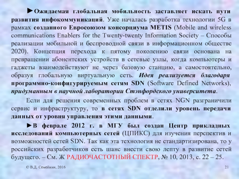 технологии 5G в рамках созданного Евросоюзом консорциума METIS (Mobile and wireless communications Enablers for the Twenty-twenty Information Society – Способы реализации мобильной и беспроводной связи в информационном обществе 2020). Концепция перехода к пятому поколению связи основана на превращении абонентских устройств в сетевые узлы, когда компьютеры и гаджеты взаимодействуют не через базовую станцию, а самостоятельно, образуя глобальную виртуальную сеть. Идея реализуется благодаря программно-конфигурируемым сетям SDN (Software Defined Networks), придуманным в научной лаборатории Стэнфордского университета.