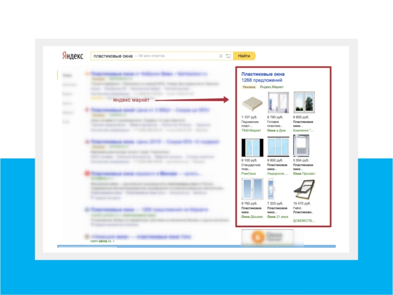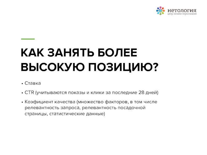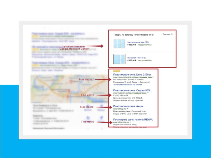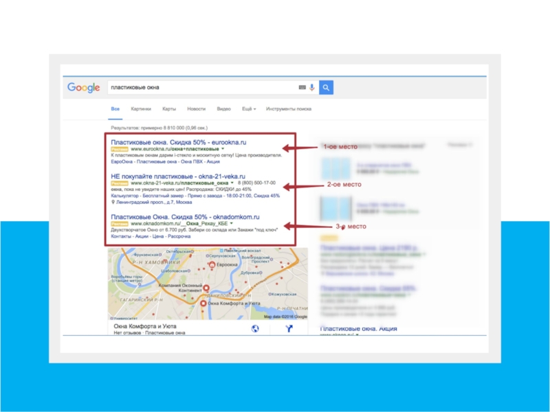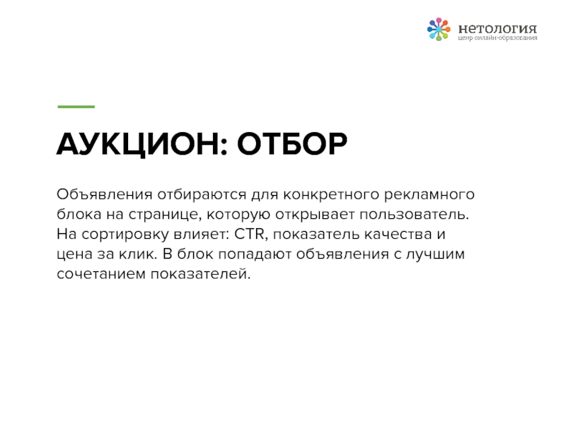 пользователь. На сортировку влияет: CTR, показатель качества и цена за клик. В блок попадают объявления с лучшим сочетанием показателей.