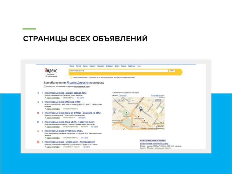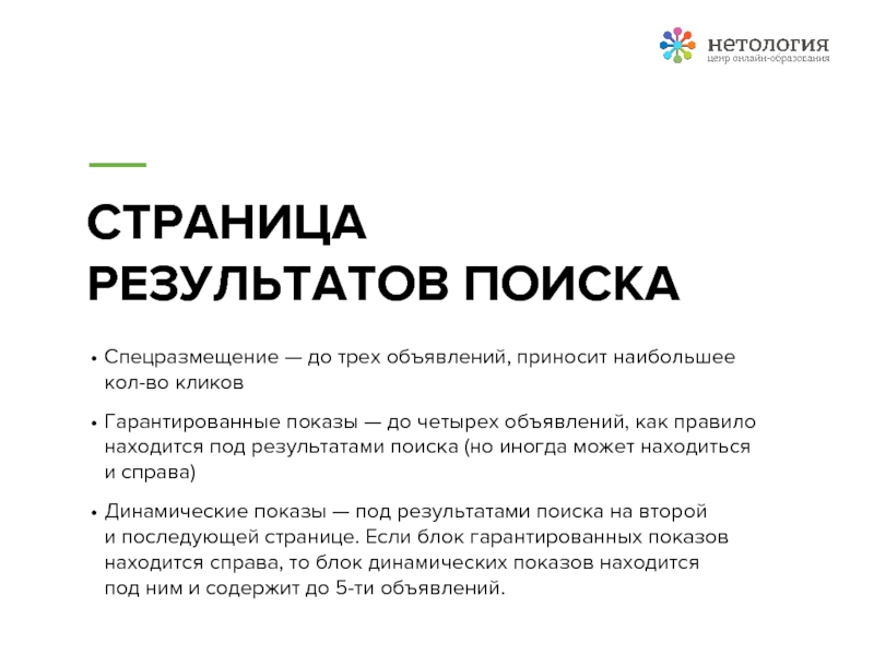 Динамические показы — под результатами поиска на второй и последующей странице. Если блок гарантированных показов находится справа, то блок динамических показов находится под ним и содержит до 5-ти объявлений.