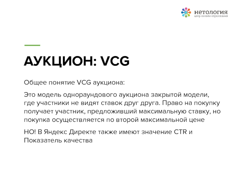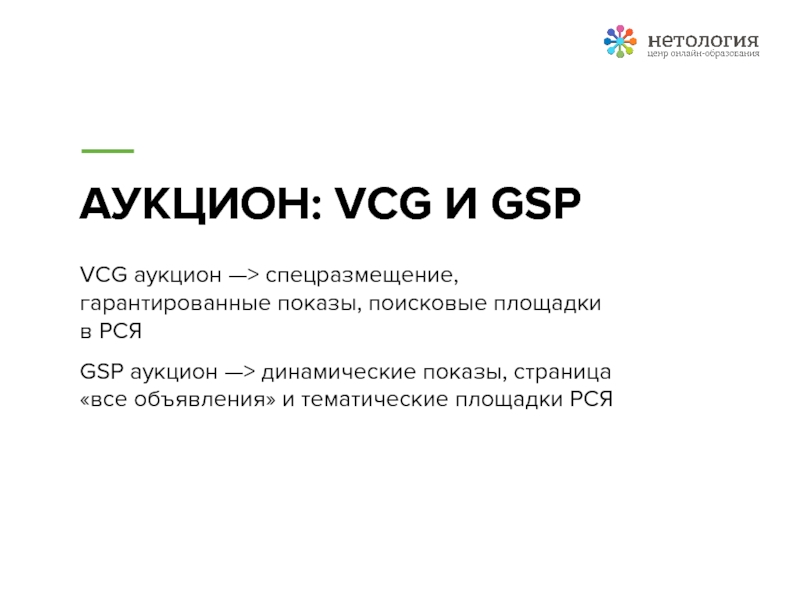 VCG аукцион —> спецразмещение, гарантированные показы, поисковые площадки
