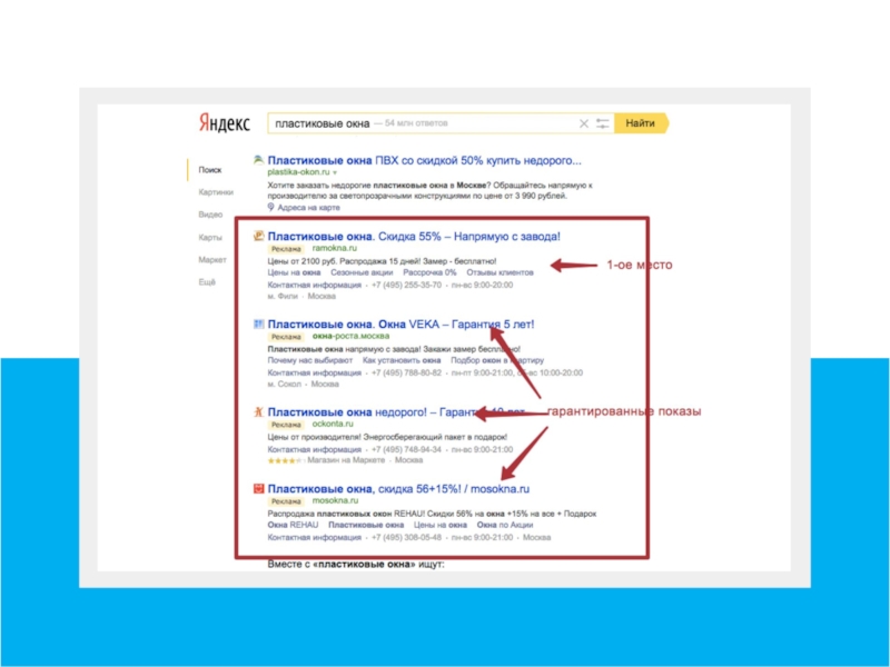 показы — до четырех объявлений, как правило находится под результатами поиска (но иногда может находиться и справа)