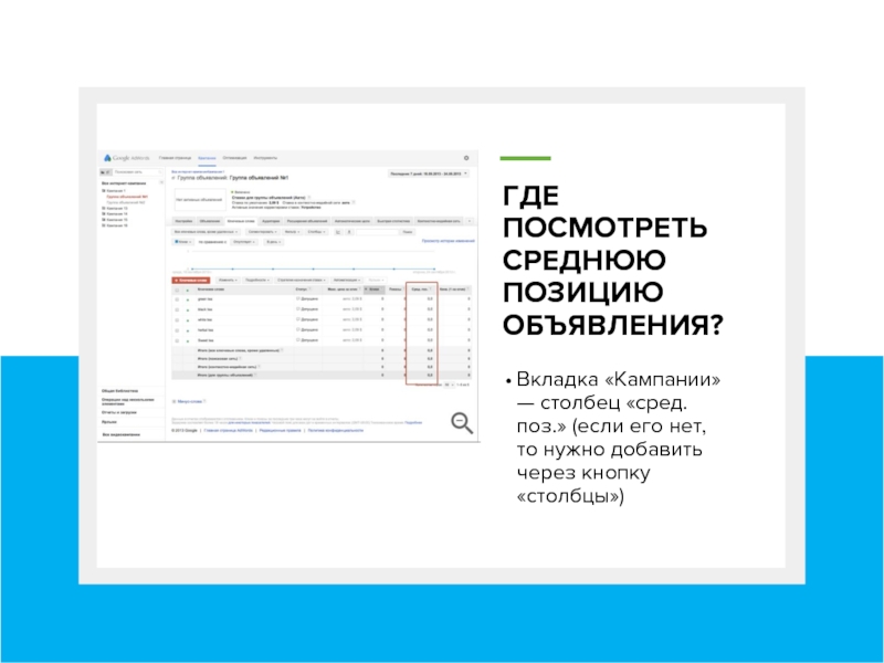 Вкладка «Кампании» — столбец «сред. поз.» (если его нет, то нужно
