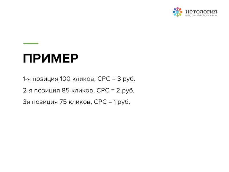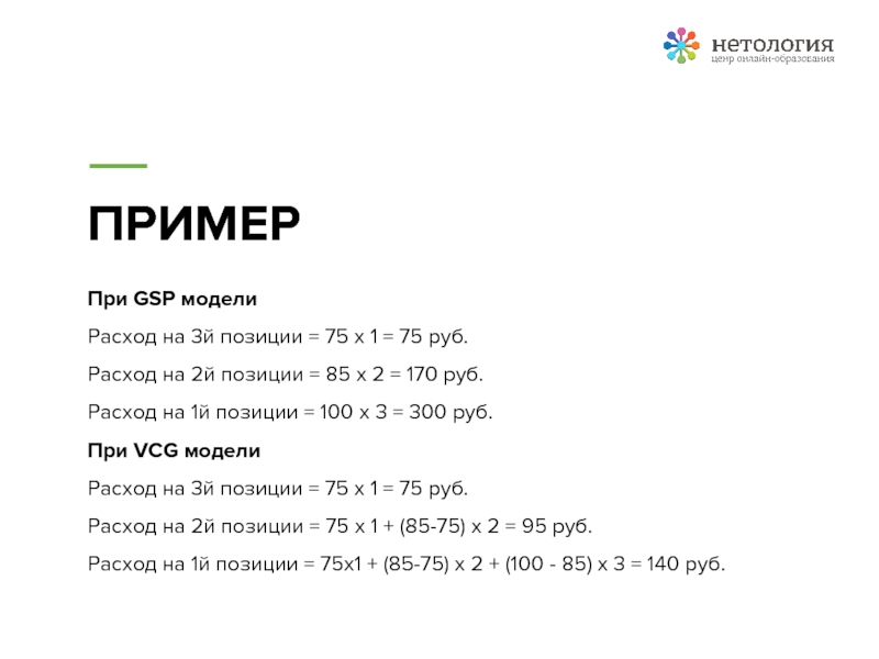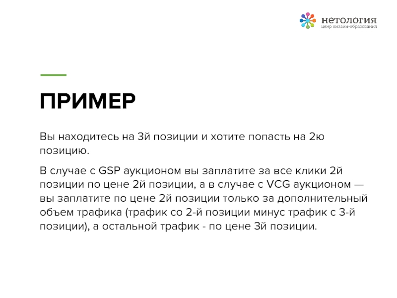 случае с GSP аукционом вы заплатите за все клики 2й позиции по цене 2й позиции, а в случае с VCG аукционом — вы заплатите по цене 2й позиции только за дополнительный объем трафика (трафик со 2-й позиции минус трафик с 3-й позиции), а остальной трафик - по цене 3й позиции.