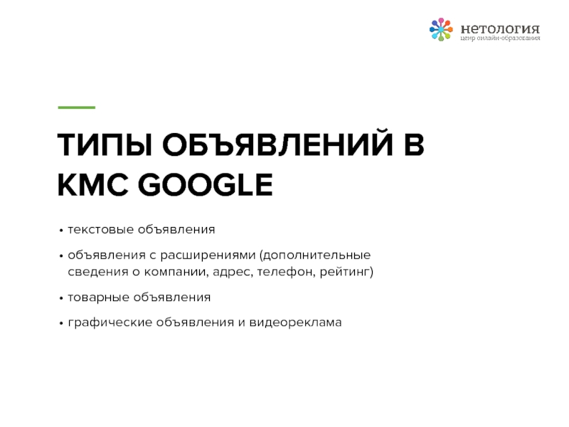 Слайд 38ТИПЫ ОБЪЯВЛЕНИЙ В КМС GOOGLE
