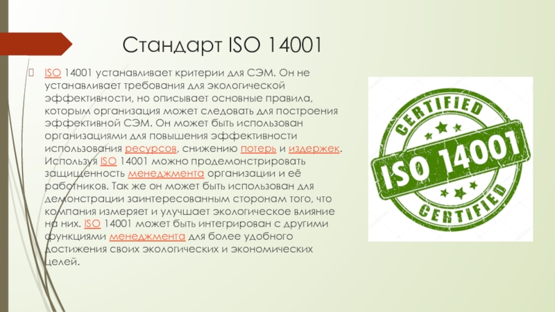ISO 14001 устанавливает критерии для СЭМ. Он не устанавливает требования