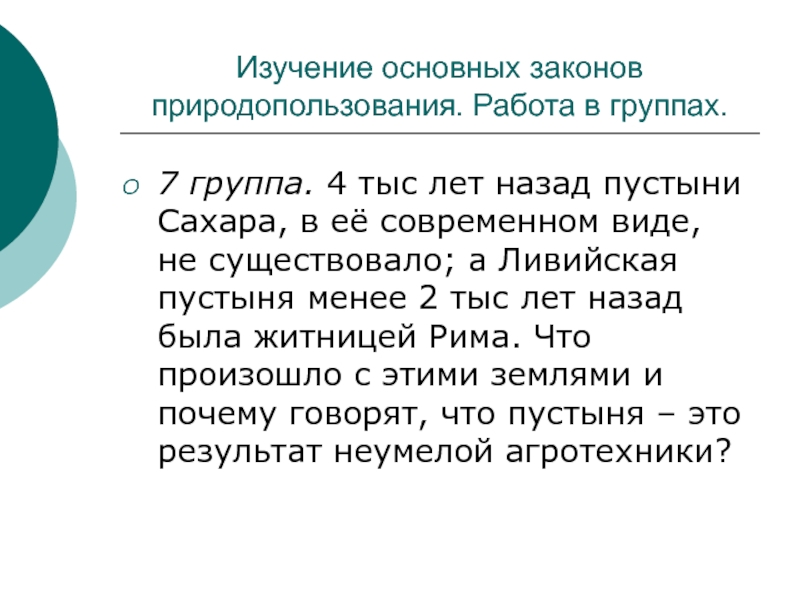Слайд 5Изучение основных законов природопользования. Работа в группах.