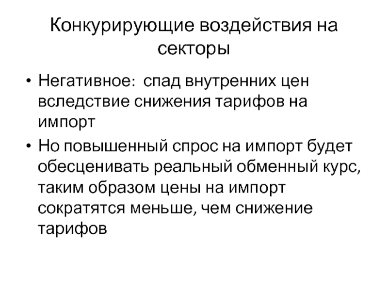 Но повышенный спрос на импорт будет обесценивать реальный обменный курс, таким образом цены на импорт сократятся меньше, чем снижение тарифов