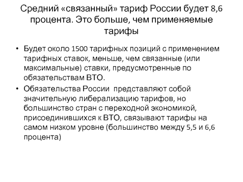 Обязательства России представляют собой значительную либерализацию тарифов, но большинство стран с переходной экономикой, присоединившихся к ВТО, связывают тарифы на самом низком уровне (большинство между 5,5 и 6,6 процента)