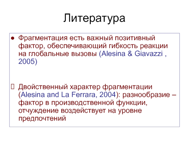Двойственный характер фрагментации (Alesina and La Ferrara, 2004): разнообразие –фактор в производственной функции, отчуждение воздействует на уровне предпочтений
