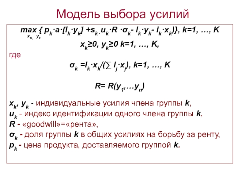 Каждая группа k осуществляет созидательную деятельность yk и деятельность, направленную на борьбу за ренту xk