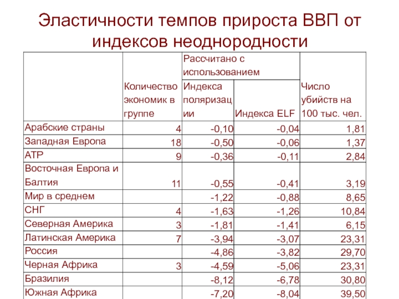 Слайд 28Эластичности темпов прироста ВВП от индексов неоднородности