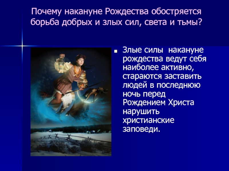 Злые силы накануне рождества ведут себя наиболее активно, стараются заставить людей в последнюю ночь перед Рождением Христа нарушить христианские заповеди.