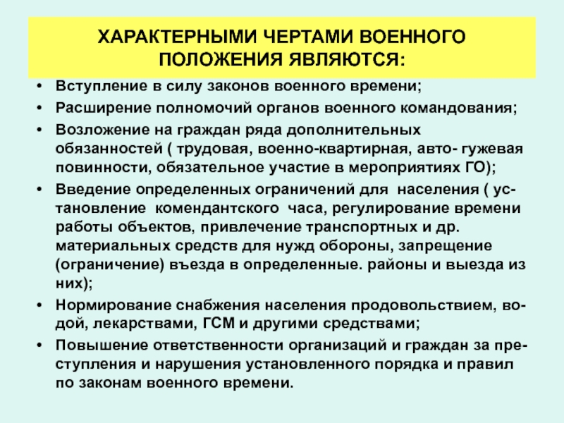 Слайд 6ХАРАКТЕРНЫМИ ЧЕРТАМИ ВОЕННОГО ПОЛОЖЕНИЯ ЯВЛЯЮТСЯ: