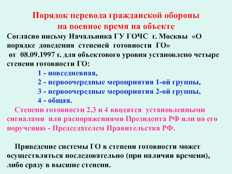 от 08.09.1997 г. для объектового уровня установлено четыре степени готовности ГО:
