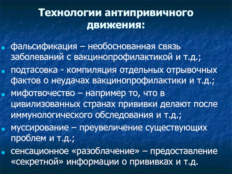 фальсификация – необоснованная связь заболеваний с вакцинопрофилактикой и т.д.;
