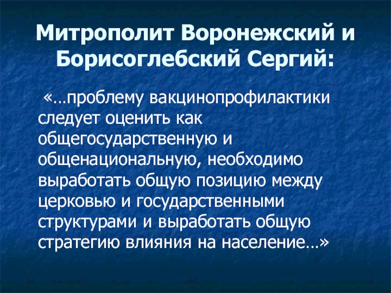 и общенациональную, необходимо выработать общую позицию между церковью и государственными структурами и выработать общую стратегию влияния на население…»