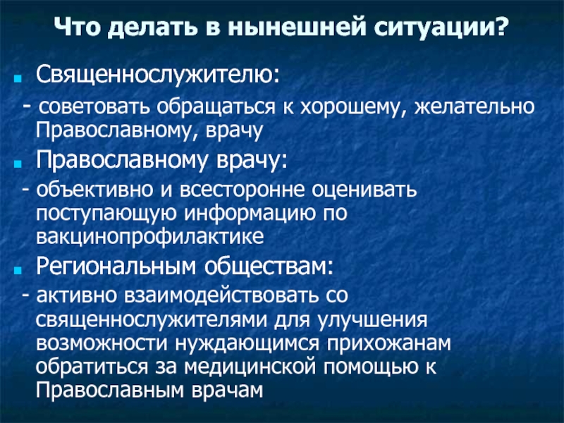 «… учитывая ценность дара жизни, данного человеку Богом, и высокую вероятность смерти при особо опасных инфекциях Священный Синод Русской Православной Церкви уже реагировал на эту проблему… … Указ Священного Синода 1804 г., предлагающий всем священникам распространять в народе правильный взгляд на прививание никто до настоящего времени не отменял…»