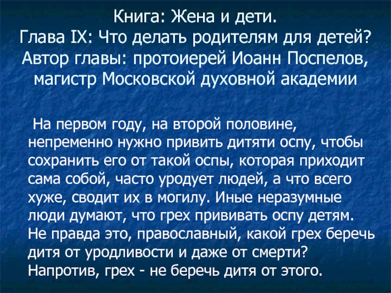 На первом году, на второй половине, непременно нужно привить дитяти оспу, чтобы сохранить его от такой оспы, которая приходит сама собой, часто уродует людей, а что всего хуже, сводит их в могилу. Иные неразумные люди думают, что грех прививать оспу детям. Не правда это, православный, какой грех беречь дитя от уродливости и даже от смерти? Напротив, грех - не беречь дитя от этого.