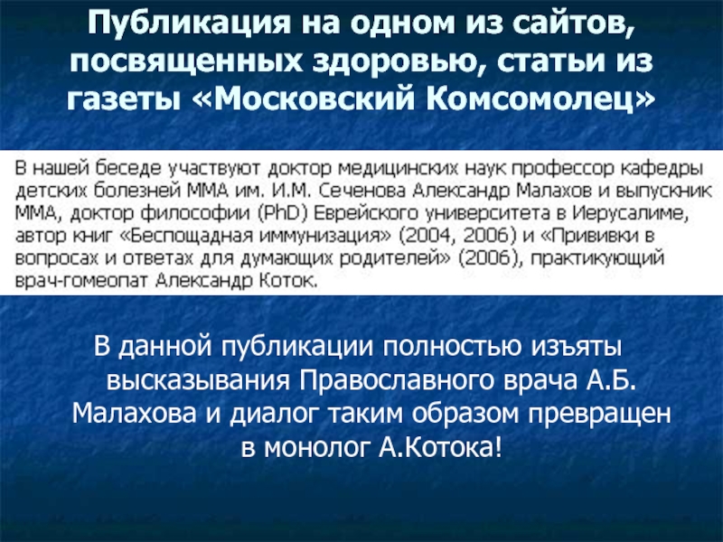Слайд 16Публикация на одном из сайтов, посвященных здоровью, статьи из газеты «Московский
