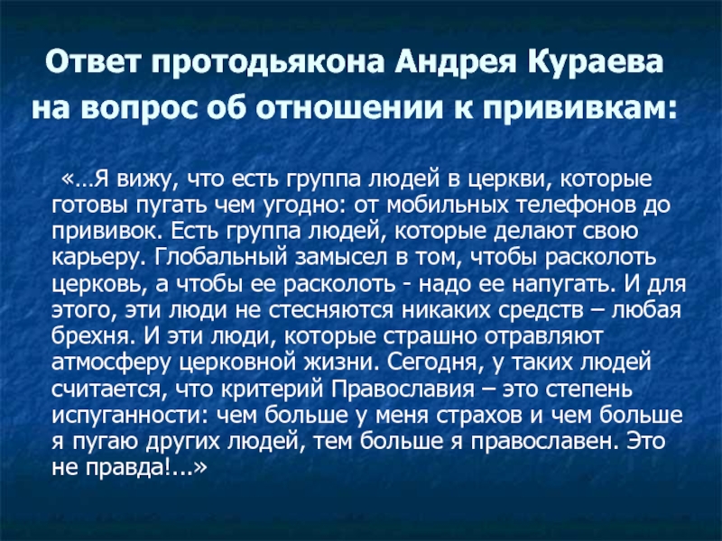 вижу, что есть группа людей в церкви, которые готовы пугать чем угодно: от мобильных телефонов до прививок. Есть группа людей, которые делают свою карьеру. Глобальный замысел в том, чтобы расколоть церковь, а чтобы ее расколоть - надо ее напугать. И для этого, эти люди не стесняются никаких средств – любая брехня. И эти люди, которые страшно отравляют атмосферу церковной жизни. Сегодня, у таких людей считается, что критерий Православия – это степень испуганности: чем больше у меня страхов и чем больше я пугаю других людей, тем больше я православен. Это не правда!...»