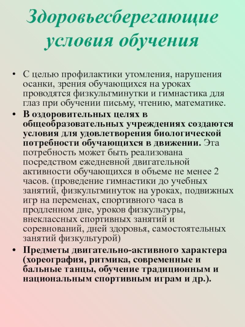 В оздоровительных целях в общеобразовательных учреждениях создаются условия для удовлетворения биологической потребности обучающихся в движении. Эта потребность может быть реализована посредством ежедневной двигательной активности обучающихся в объеме не менее 2 часов. (проведение гимнастики до учебных занятий, физкультминуток на уроках, подвижных игр на переменах, спортивного часа в продленном дне, уроков физкультуры, внеклассных спортивных занятий и соревнований, дней здоровья, самостоятельных занятий физкультурой)