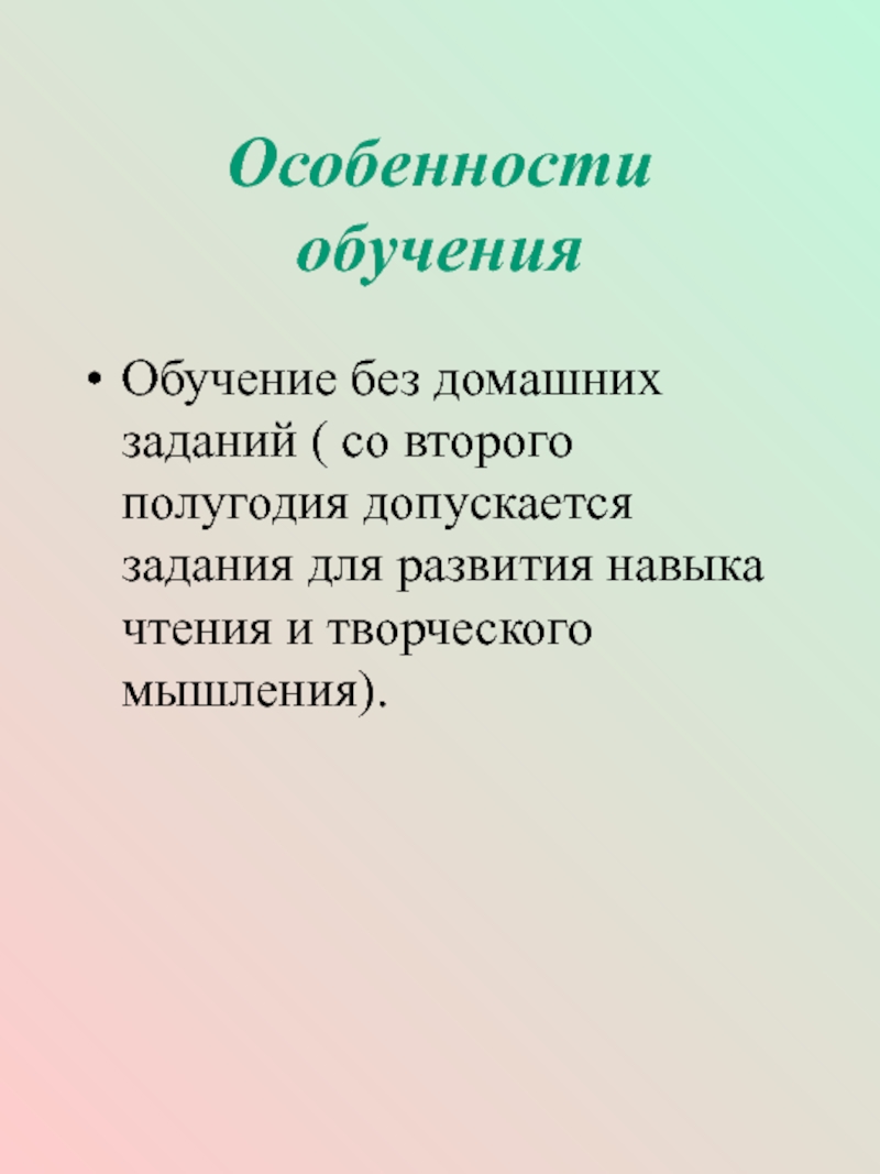 Обучение без домашних заданий ( со второго полугодия допускается задания